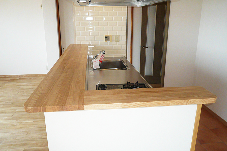 当初はリビングダイニングが狭く、対面式のキッチンも閉塞的でした。ダイニングキッチンと隣接する洋室を取り込み、約20畳の広いLDKへ間取り変更しました。また、壁付I型キッチンにカウンターを造作し、アイランドキッチン仕様に仕上げました。無垢床材・珪藻土・タイル・木製のメディシンボックス等、自然素材を生かした内装で、とても優しい空間に仕上がりました。