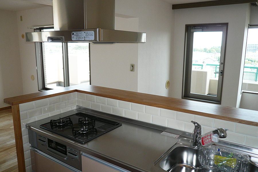 | 施工場所 | 藤沢市 | 内容 | 無垢ナラ材フローリング貼り、珪藻土塗布、キッチン交換、造作洗面台 |